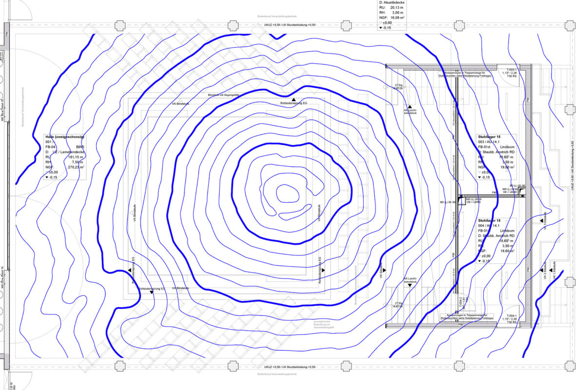 Vorgeschlagen wird eine zeichnerische Gestaltung im Foyer. Unter der Lamellendecke erstreckt sich die blaue Zeichnung der geografischen Höhenlinien des heiligen Berges Fuji. Sie sind zwar direkt dem Verlauf der Höhenlinien dieses Vulkans nachempfunden. Dennoch ist die Zeichnung vieldeutig erfahrbar und interpretierbar z.b. als Wellenformen, Dünenzeichnungen, landschaftliche Assoziationen und nicht zuletzt, eine Darstellung akustischer Phänomene.