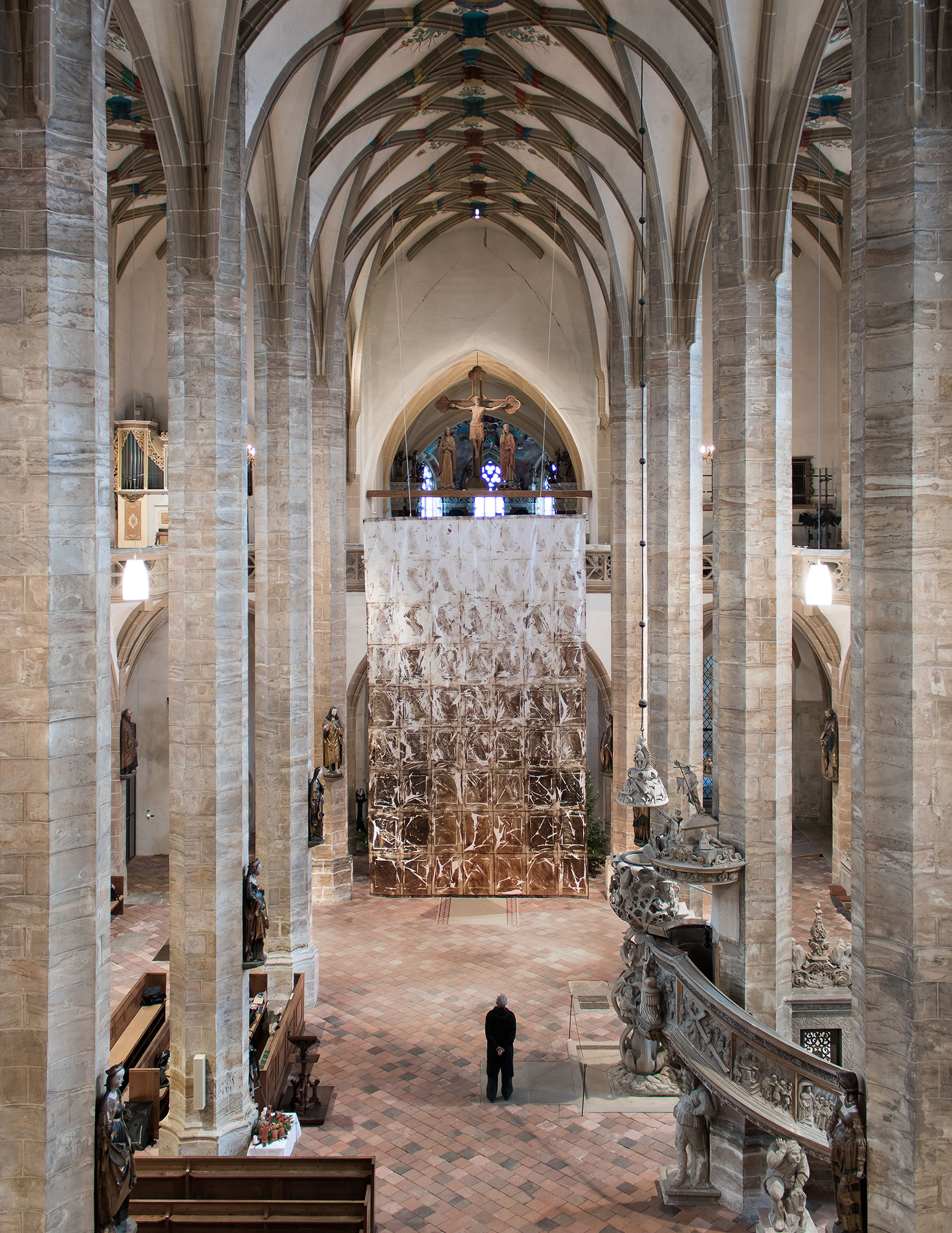 Die hellen und dunklen, erdigen Braun- und Ockerfarben des aus knapp 60 hauchdünnen Seidenpapierblättern zusammengefügten Bildes korrespondieren mit den Farben des Steins im Dom, obwohl Michael Morgner vor drei oder vier Jahren, als er die sich nun sanft im großen Kirchenraum bewegenden Blätter bedruckte, nicht wusste, an welchem Ort und ob sie überhaupt einmal irgendwo hängen werden. „Vielleicht“, sagt der Künstler, „liegt es daran, dass ich aus der Gegend komme. Chemnitz, Erzgebirge, das ist mir nahe.“ So erklärt sich vielleicht eine unbewusste Affinität zur Architektur und zu den Farben des Doms. Die einzelnen Blätter sind in Morgners ganz eigener Technik mit dunkler Lackfarbe bedruckt – von fast unsichtbar dort, wo das Papier die mit Farbe bestrichene Druckplatte mit der Symbolform des aufrechten Menschen kaum berührt, nur gestreichelt hat, bis kräftig erdig braun dort, wo Farbe und Papier heftig in Berührung kamen. So oszilliert auch die menschliche Figur zwischen Auftauchen und Verschwinden. Zudem nehmen die Blätter die Knitter des Papiers wie Narben des Lebens auf. Anschließend hat der Künstler die Papiere so zusammengefügt, dass sich ein Farbverlauf vom Dunklen unten ins Helle nach oben ergibt – einer Auferstehung gleich, die den Menschen sowohl erinnernd für die Erde bewahrt wie auch in der Weite des Himmels aufgehen lässt.