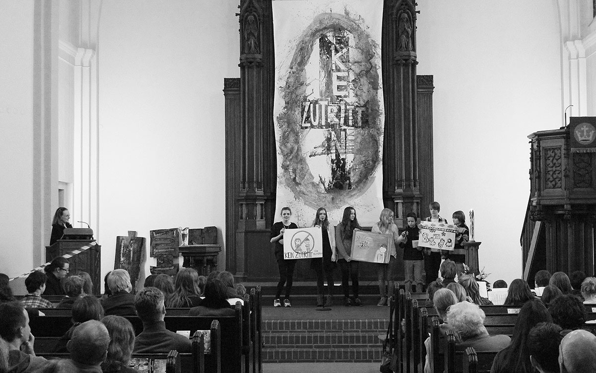 »KEIN ZUTRITT« ist der Titel des Fastentuches, das Felix Droese für die Paul-Gerhardt-Kirche im Rahmen der jährlichen Altarverhüllung zur Passionszeit angefertigt hat. Diese Arbeit wird in den 7 Wochen vor Ostern vor dem historischen Altarbild von Gerhard Noack mit dem auferstandenen Christus hängen und dieses vollständig abdecken. Felix Droese, geboren 1950, Sohn eines altkatholischen Pfarrers, Schüler von Joseph Beuys und mit seinen Arbeiten u.a. auf der Documenta 7 in Kassel und der 43. Biennale in Venedig vertreten, ist mit dieser Arbeit nach Sabine Herrmann und Michael Morgner der dritte Künstler, der an der Altarverhüllung in der Paul-Gerhardt-Kirche teilnimmt.