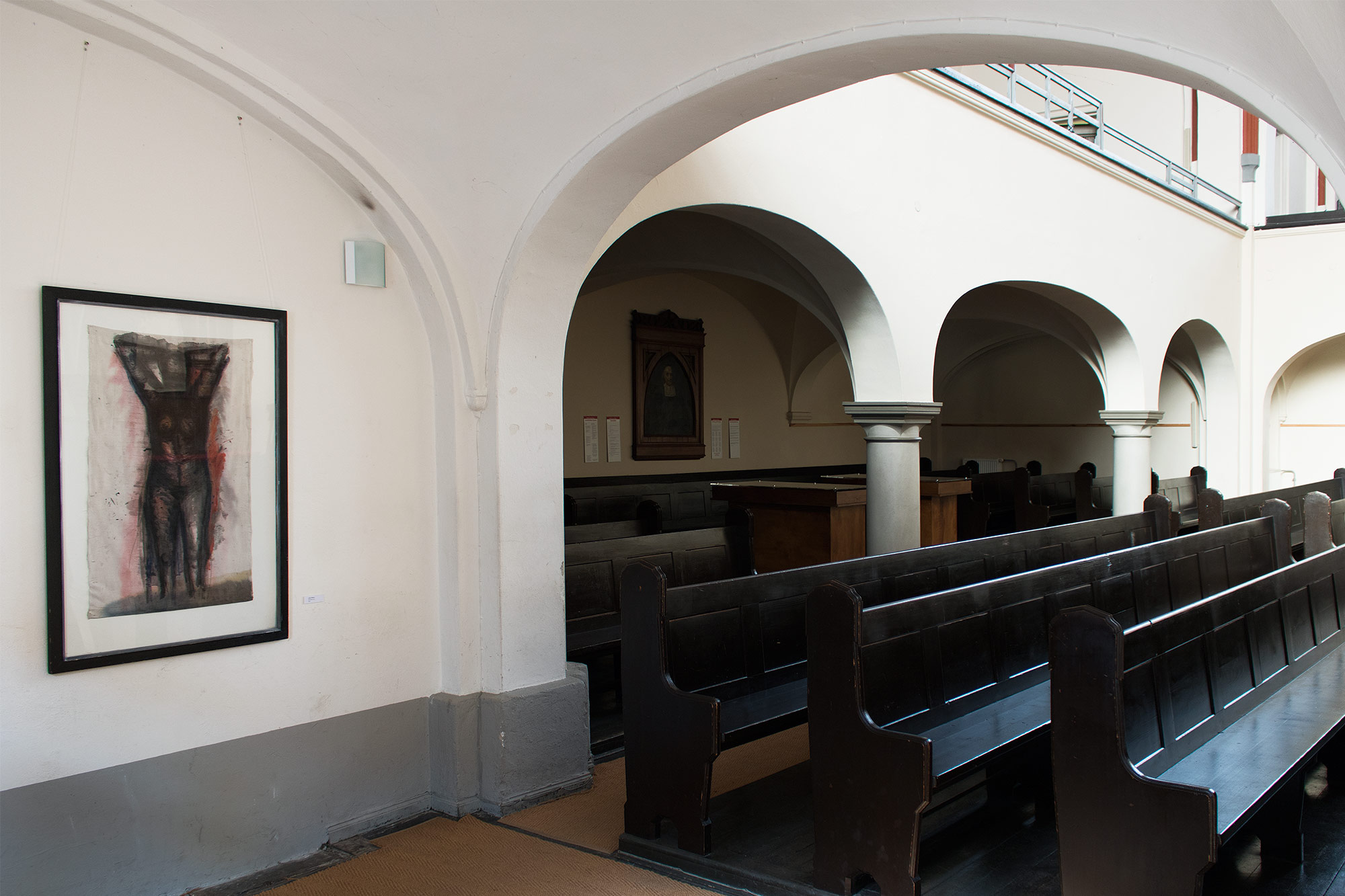 Sein jüngstes Werk hängt nun vor uns. Was sehen wir? Der erste Blick zeigt uns eine Frau. Obwohl, ist diese Geschlechtsangabe so wichtig? Zeigt dieses Bild nicht einfach eine Figur, eine Gestalt, die wohl weibliche Züge trägt, aber doch vor allem ein Mensch und ein Körper ist. Was für ein Körper? Ein leidender, wie es für ein Passionsbild nahe läge? Dunkel ist diese Gestalt, schwarz und streng, aber auch farbig durchglüht, mit einer Wärme, die aus der Tiefe des Bildes kommt. Sie strahlt Stärke aus, ist konzentriert und gefestigt, hat eine durchgeformte Form, steht aufrecht, wirkt fast wie gepanzert, auf jeden Fall souverän, ja irgendwie auch erotisch souverän. Dies ist keine Schmerzensfrau, eher eine Kriegerin mit dem helmartigen Schädel und den röhrenartigen Gliedern, ihrer schwarzen Aureole. Doch da sehe ich vielleicht zu viel in diese Gestalt hinein. Wichtiger ist etwas anderes: die seltsame Spannung dieser Gestalt zwischen dem Heute und dem Damals, zwischen der Moderne und dem Archaischen. Sie ist unverkennbar die Kreation eines zeitgenössischen Künstlers und verweist doch weit zurück auf eine uralte Geschichte: nach Mykene, auf mythologische Figuren der Antike und – so wie sie hier hängt – auf Darstellungen des Gekreuzigten.