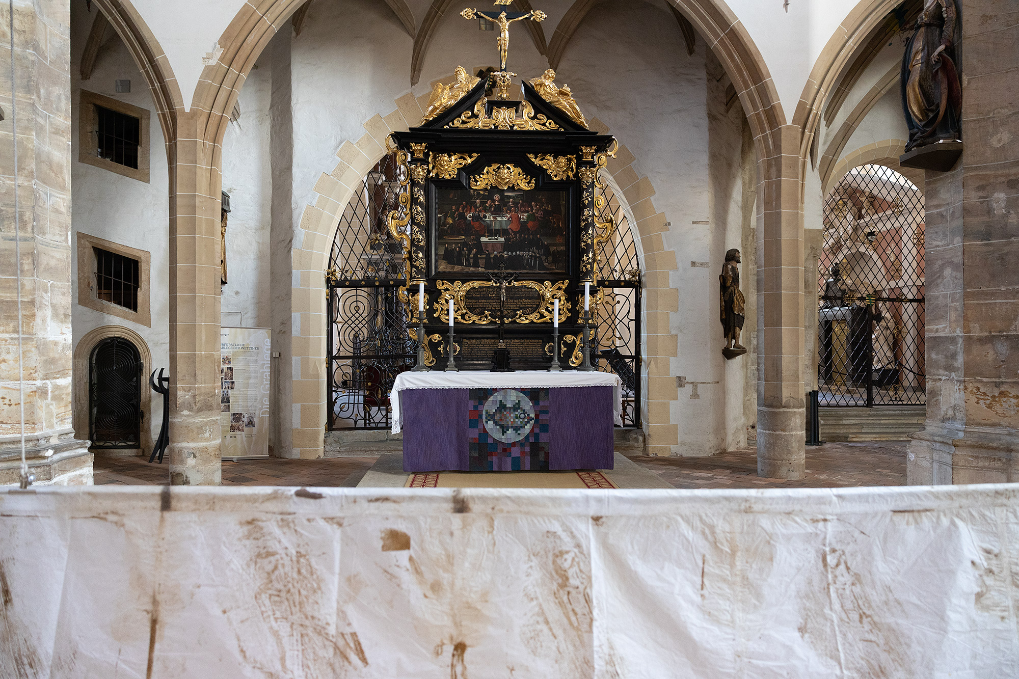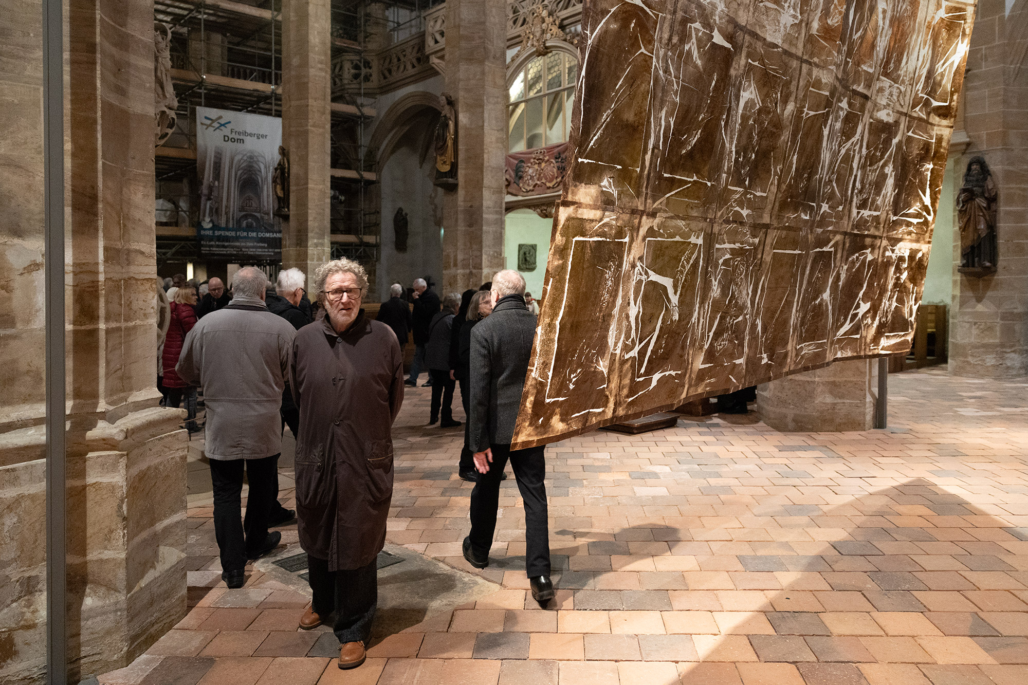 Michael Morgners „Fastentuch“ tritt damit sanft wehend vor dem reich verzierten Altar des Doms in einen spannenden Dialog mit der gotischen Kunst des Freiberger Doms, die die Menschen in ihrem irdischen Ringen ebenso darstellt wie biblische Szenen um das Leben und Sterben Jesu. Indem das Fastentuch den Altar, das Zentrum der Kirche, verhüllt, in der Passionszeit unsichtbar macht, lenkt es den Blick der Menschen auf sich selbst und ihr eigenes Verhältnis zu Gott und der Welt.