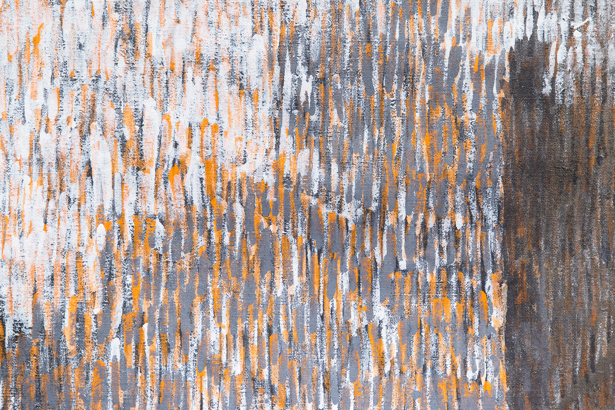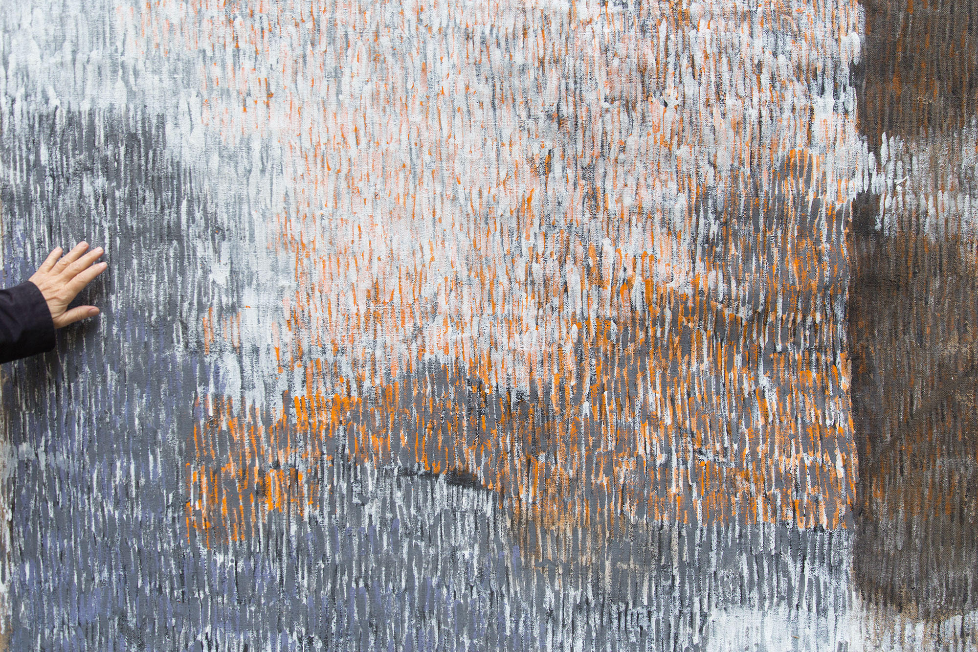 Einen ungrundierten, groben Jutestoff, auf einem Keilrahmen gespannt, hat Sabine Herrmann mit unendlich vielen weißen Pinselstrichen ‚grundiert’ und darüber graue und orangefarbene Striche gesetzt, die am rechten Bildrand immer dunkler werden. Darüber hat sie in der Art von Weißhöhungen wiederum weiße Striche gesetzt, die sich mit den orangeroten und grauen Tönen mischen. Die Farben entsprechen dem Farbschema der Paul-Gerhard-Kirche, aber auch dem Farbspektrum des verdeckten ursprünglichen Altarbildes.